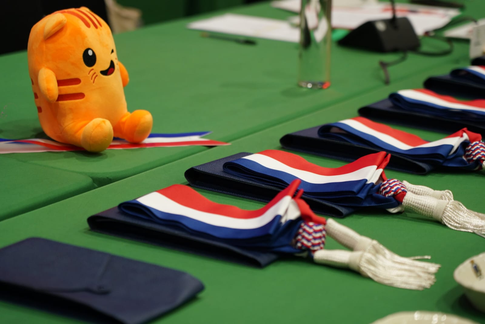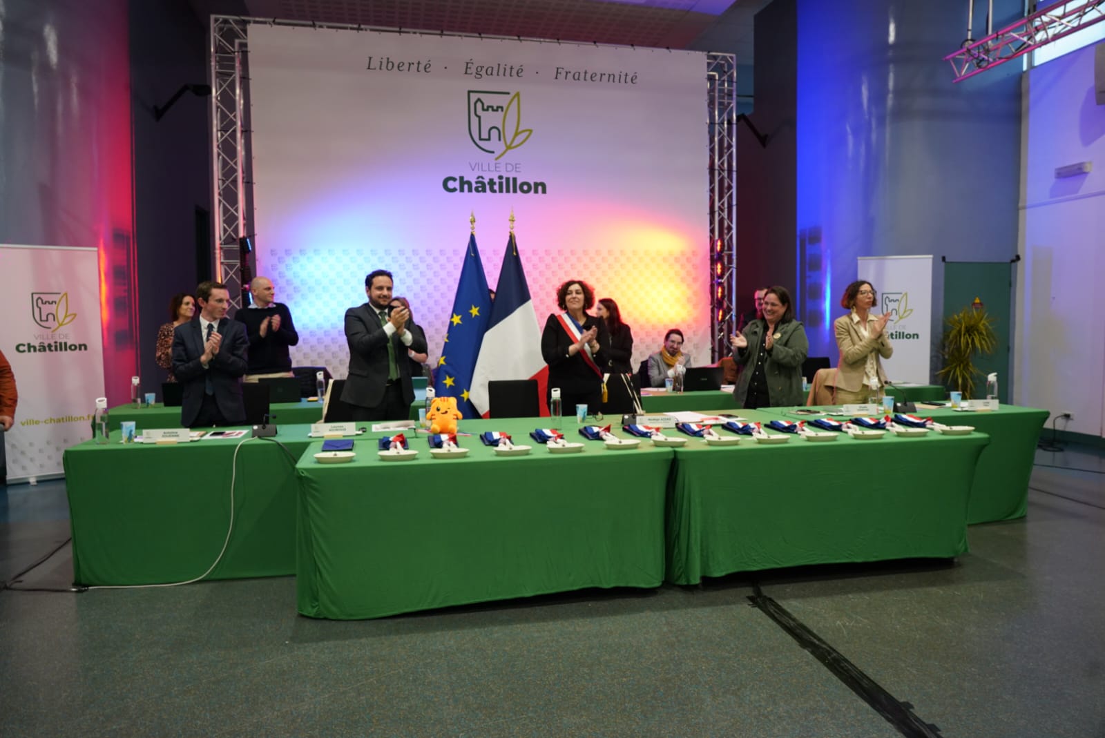 Les écharpes tricolores remises aux élus, aux côtés de Tillon, la mascotte de la Ville. -