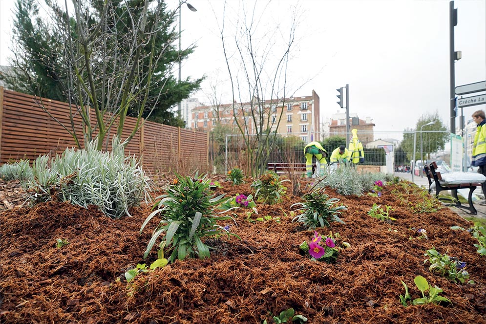 Les agents des parcs et jardins aménagent le nouveau massif paysager à proximité du square Jean Moulin.