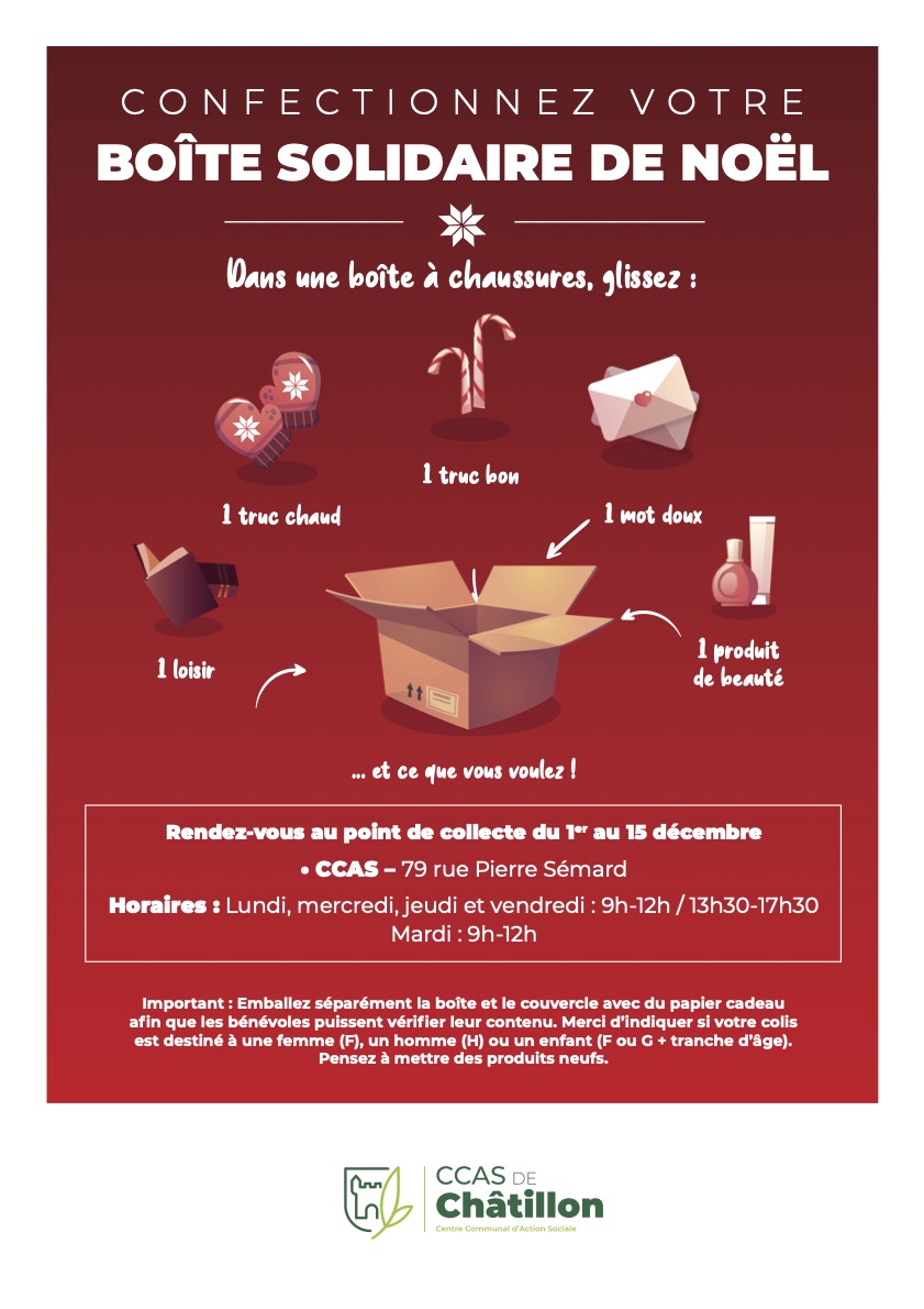 À l’occasion des fêtes de fin d’année, le CCAS invite les Châtillonnaises et les Châtillonnais à se mobiliser pour offrir un moment de réconfort aux personnes en difficulté.