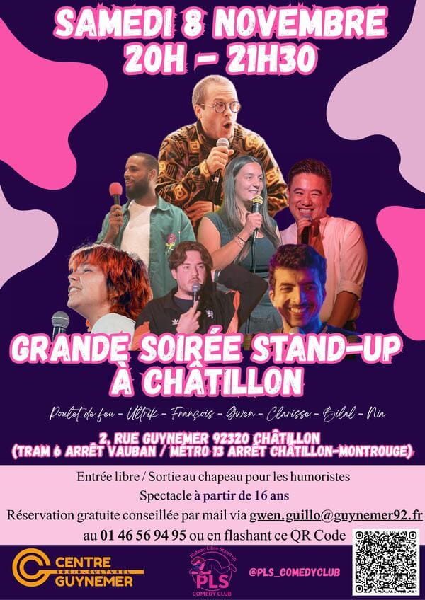 La toute première soirée Stand Up à Châtillon aura lieu dans la grande salle de spectacle du Centre Guynemer ! Il s’agit d’un plateau avec 7 humoristes qui vont se succéder sur scène, l’entrée est libre et la sortie est au chapeau, c’est à dire en fonction de ce qu’on peut donner pour les artistes qui ont fait le déplacement.
