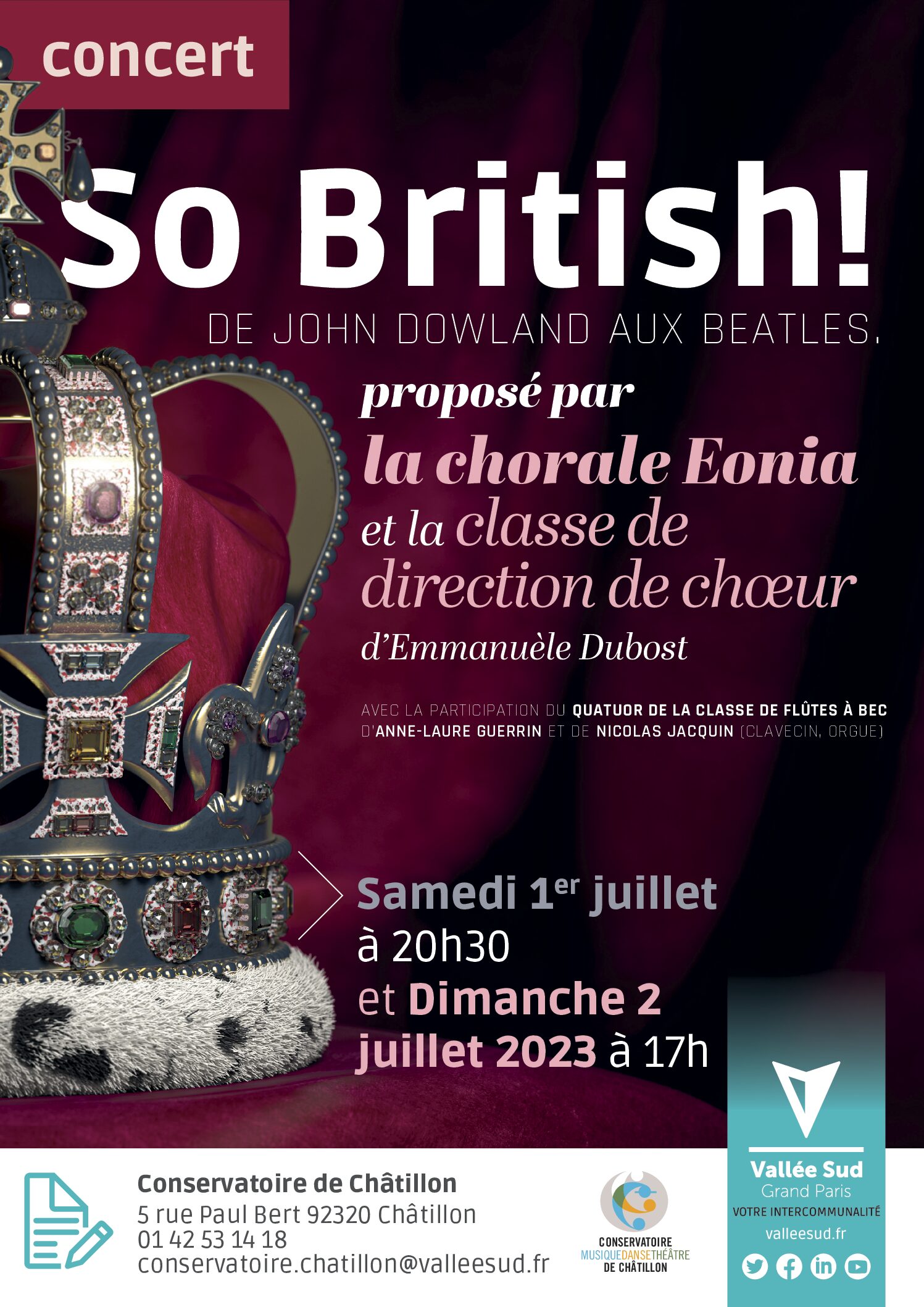 Pour “couronner” une saison 22-23 riche en évènements outre-Manche, la chorale Eonia et la classe de direction de chœur d’Emmanuèle Dubost vous proposent 2 concerts gratuits d’une durée d’une heure à l’auditorium du conservatoire de Châtillon :